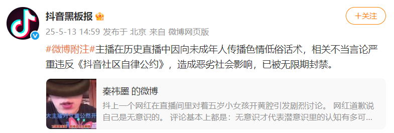 5月13日,据“抖音黑板报”通报:主播在历史直播中因向未成年人传播色情低俗话术,相关不当言论严重违反《抖音社区自律公约》,造成恶劣社会影响,已被无限期封禁。0gq商标转让-商标交易-专业商标买卖服务平台|金标汇商标转让网