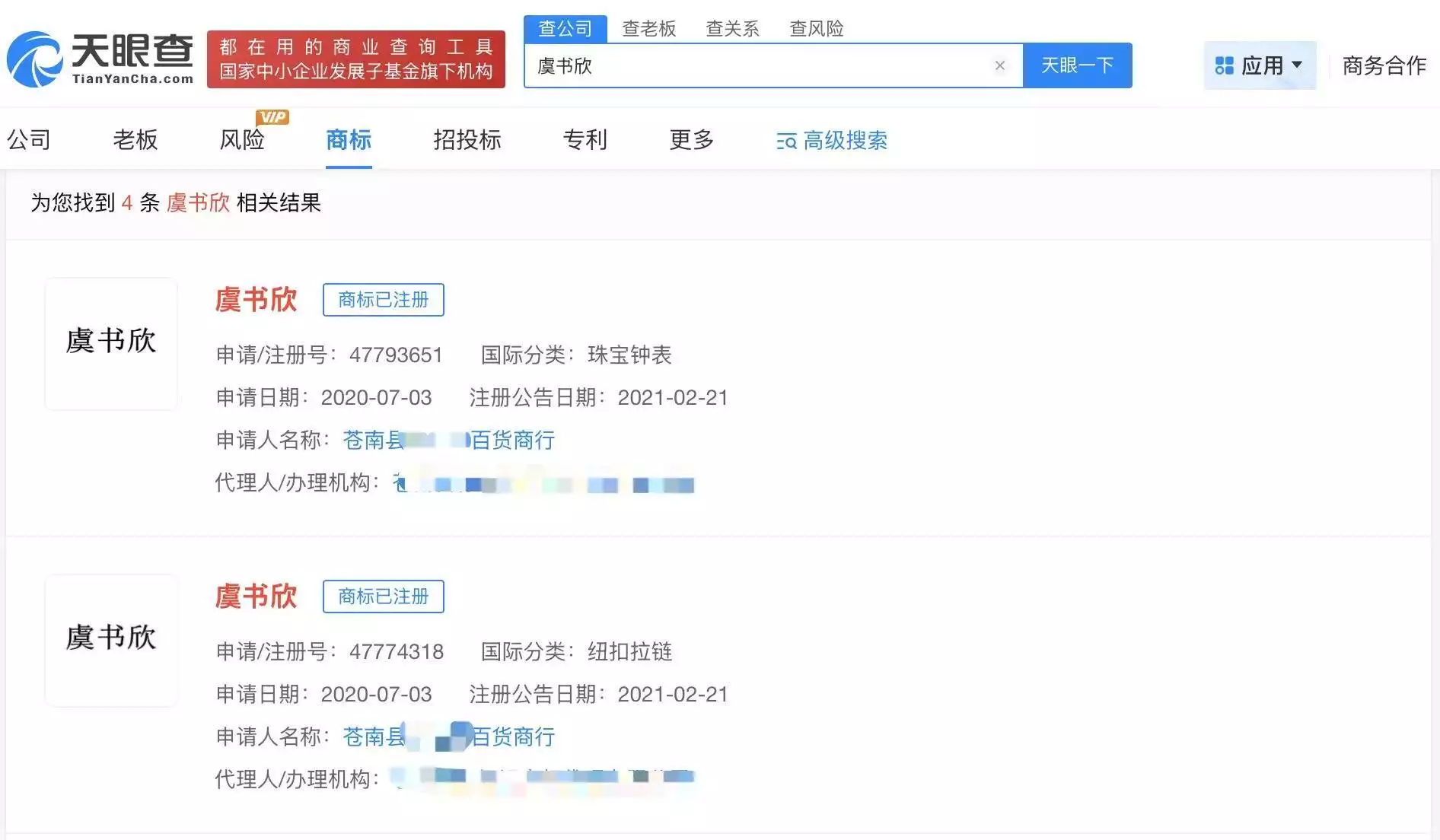 在职业发展的另一面,虞书欣的个人品牌保护意识也显露无遗。据天眼查信息显示,早在2020年7月,“虞书欣”这一名字已被苍南县某百货商行申请注册为商标,涵盖珠宝钟表、纽扣拉链等类别,并于次年2月成功获得注册批准。这一举措无疑为虞书欣的个人品牌筑起了一道法律防线。